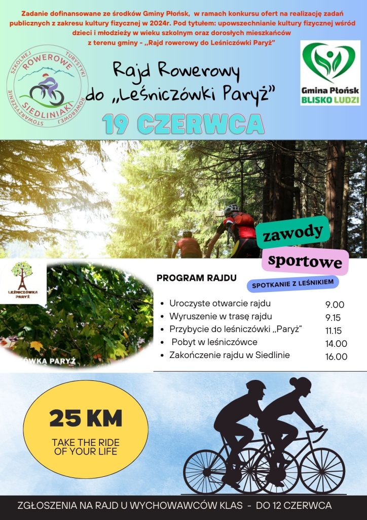 Zadanie dofinansowane ze środków Gminy Płońsk w ramach konkursu ofert na realizację zadań w ramach konkursu ofert na realizację zadań publicznych z zakresu kultury fizycznej w 2024r. Pod tytułem upowszechnianie kultury fizycznej wśród dzieci i młodzieży w wieku szkolnym oraz dorosłych mieszkańców z terenu gminy – „Rajd Rowerowy do Leśniczówki Paryż”