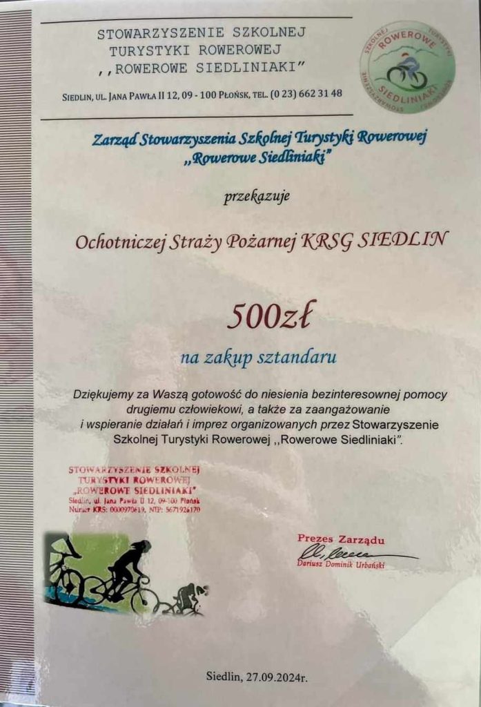 Miło nam poinformować, że Zarząd Stowarzyszenia Szkolnej Turystyki Rowerowej „Rowerowe Siedliniaki” przekazał Ochotniczej Straży Pożarnej KRSG Siedlin 500 zł na zakup sztandaru.
